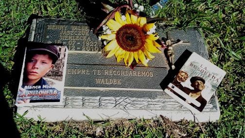 Hoy 12 de diciembre se cumplen nueve años desde el fallecimiento de Waldek. Como siempre, fui al cementerio y con mi hijo recordamos los momentos felices con él. Era un hombre divertido, siempre veía el lado bueno de la vida, y tenía unas ocurrencias que nos hacían reír. Estoy en paz conmigo, y siempre le estaré agradecida porque gracias a la fe que tuvo en mí al pedirme que escribiera su historia me convertí en escritora. Quise tomar esta foto porque él leyó la primera edición, la de los dos niños riendo. La otra, que publiqué por Amazon no llegó a conocerla. Es la misma, pero con otra portada. Le llevé un girasol, era la flor que más le gustaba. Decía: "Es una flor útil. De sus semillas se hacen unos pasteles muy ricos".